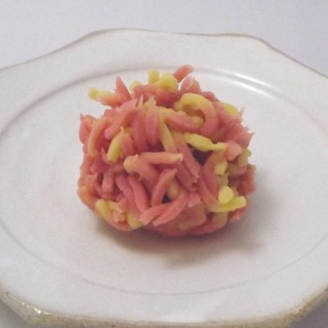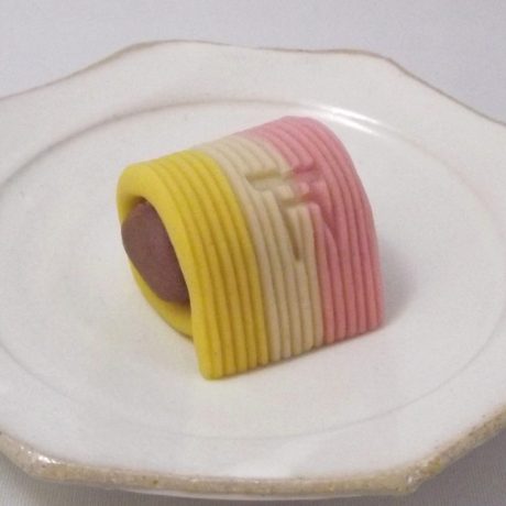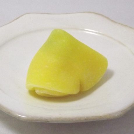 黄色は拝殿の鈴を表した、練切製のお菓子です。